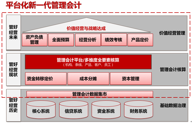 平台化新一代管理会计的核心是管理会计平台。基于管理会计平台,金融机构才能在统一“度量衡”上开展价值经营管理活动,采取行动成就业务绩效,是管理好经营好未来。管理会计平台,满足机构、条线、产品、客户、客户经理等多维度业绩评价需要,建立以EVA、RAROC为核心,覆盖规模、价格、收入、成本、利润、效率等全要素核算分析体系,为资源配置、客户经营、产品定价、绩效激励等基于价值管理提供决策依据。