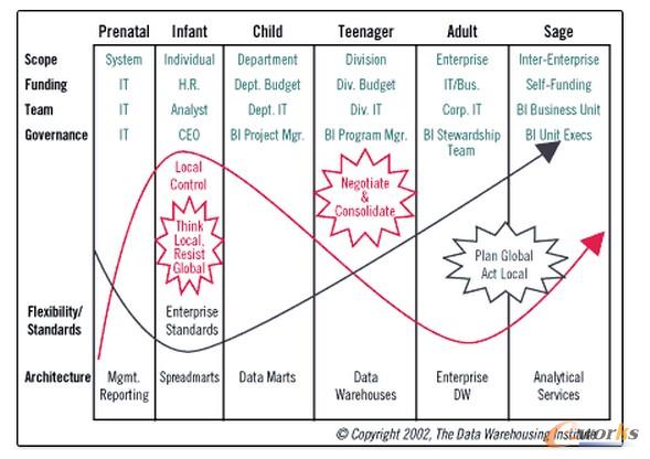 今天又很多数据仓库项目经理都在问以上的问题。不幸的是,没有一个容易的解答。TDWI开发了一个数据仓库成熟度模型,以供参照。这个模型提供了一个便捷的方式来衡量你的数据仓库解决方案,现在在哪,下一步该怎么做。