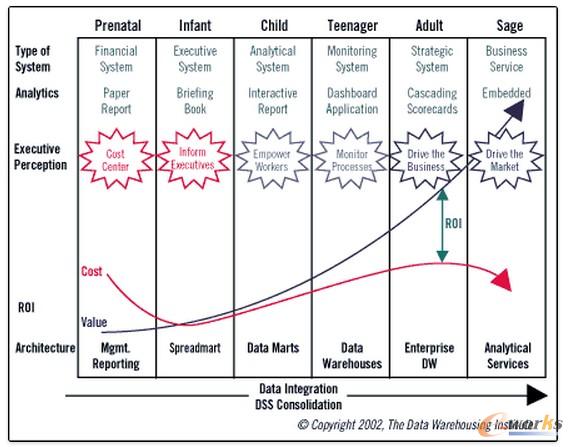 投资回报率。在成人期,数据仓库带来的价值开始超过对其的投资了,尤其是在规模经济和快速开发上(见图3)。而且,这时候用户开始发现数据仓库的新的用途,这些用途甚至当时的开发人员都没有预料到,这又进一步提高了投资回报率。