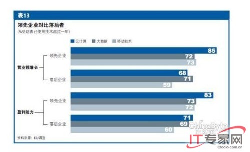 《经济学人》的报告还显示,领先的公司可以从云计算、大数据及移动技术的投资中获得更大的益处。以云计算为例,通过采纳云计算(79%)来降低固定投资成本的盈利性领先企业的数量大大高于采取同样行动(63%)的落后企业的数量,这说明,与同业公司相比,许多领先公司通过更好地使用技术以实现更大的成本缩减。