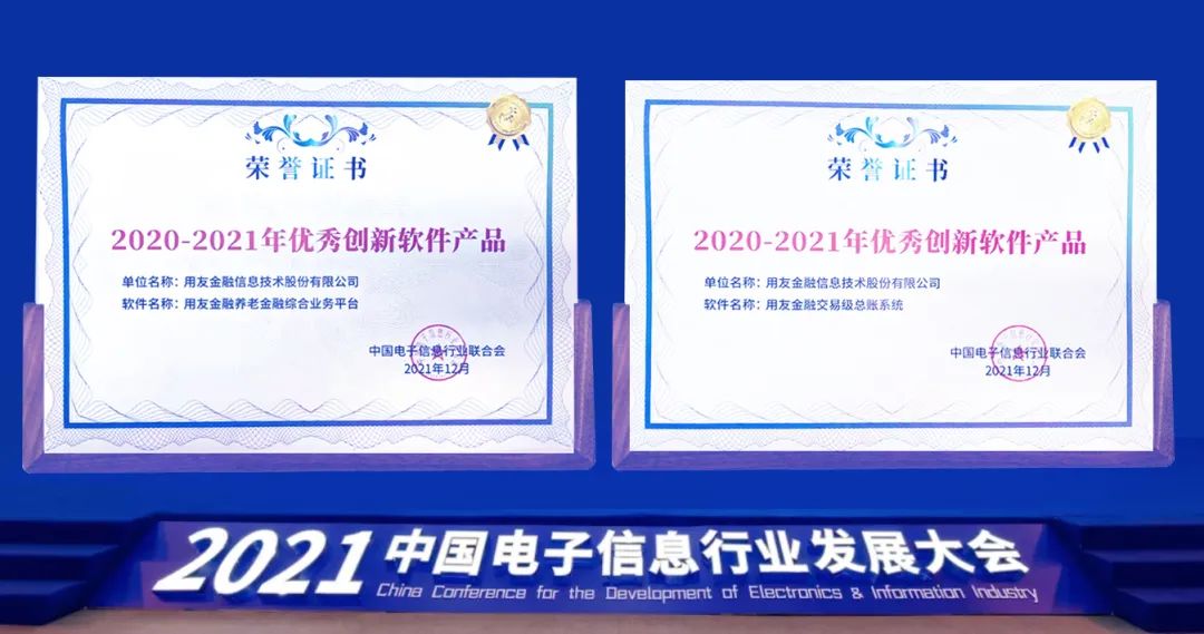 近日,2021年度中国电子信息行业发展大会在盐城召开。大会由中国电子信息行业联合会与盐城市人民政府共同举办,业内专家学者、企业家代表等汇聚一堂,分析当前我国电子信息产业发展形势与任务,解读产业政策,部署来年工作,全面助力我国电子信息产业高质量发展,共商发展大计,共谋宏伟蓝图。大会同时开展2020-2021年度优秀创新软件产品评选工作,旨在激活企业内生产力、提高企业品牌竞争力、推动企业市场开拓。经过中国电子信息行业联合会组织中国国际软件博览会组委会专家委员会专家进行资料审核评定,米兰官方版网站登录入口-米兰(中国) 交易级总账系统及米兰官方版网站登录入口-米兰(中国) 养老金融综合业务平台两大产品均荣获“2020-2021年度优秀创新软件产品”奖。