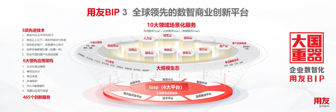 面对难得的市场和产业发展机遇,用友经过6年的规模研发、持续迭代,以全新理念、全新技术、全新架构、全新模式打造了面向企业和公共组织数智化的全新一代产品——用友BIP,并在平台技术、应用架构、创新服务等方面实现多项重大突破与升级,达到全球领先水平,包括5项先进技术、6大领先应用架构、465项创新服务,覆盖智能财务、数智人力、数智采购、数智营销、智能制造、数智供应链、数智研发、数智项目、数智资产及协同工作等十大核心领域,是目前全球领域覆盖最多的企业云服务群。