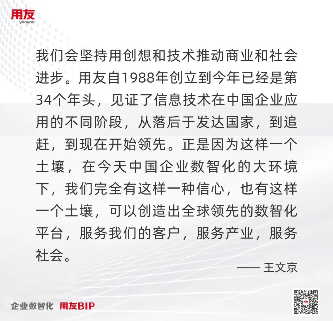 用友成立于1988年,34年以来,用友一直专注于推动信息技术与企业应用的融合发展,用新技术赋能企业,让科技价值使能企业高质量发展。