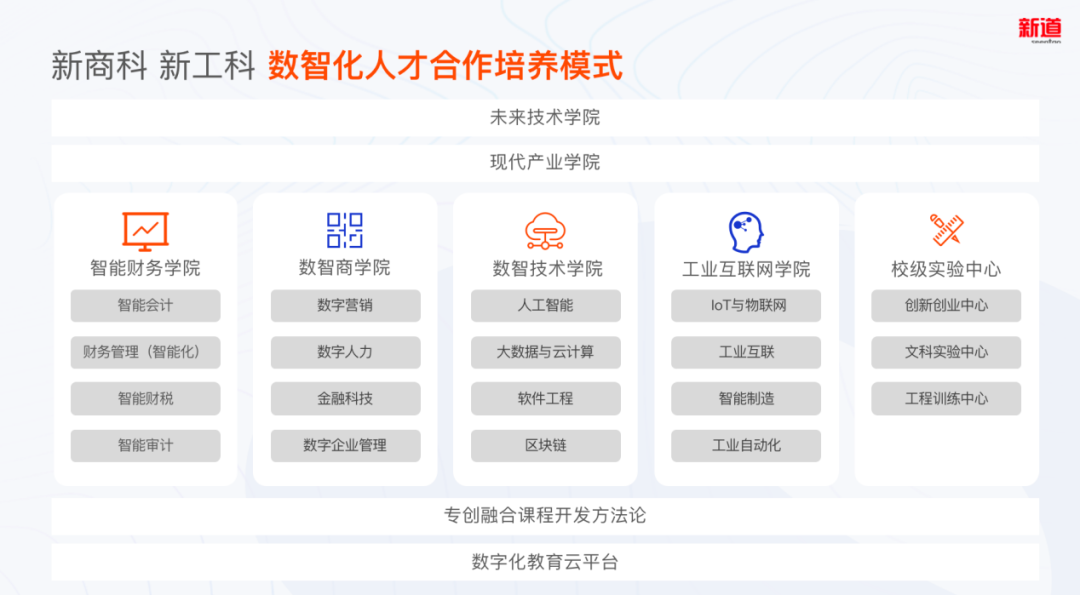 数智时代,企业产业和国家需要大量的数智化人才,用友发挥在数智化平台技术领先优势,利用用友BIP赋能数智化人才培养,并通过教育科技公司新道科技,践行产教融合,为院校和培训机构提包含供课件、实验实训、课程开发、专业共建、产业学院等在内的多种服务。
