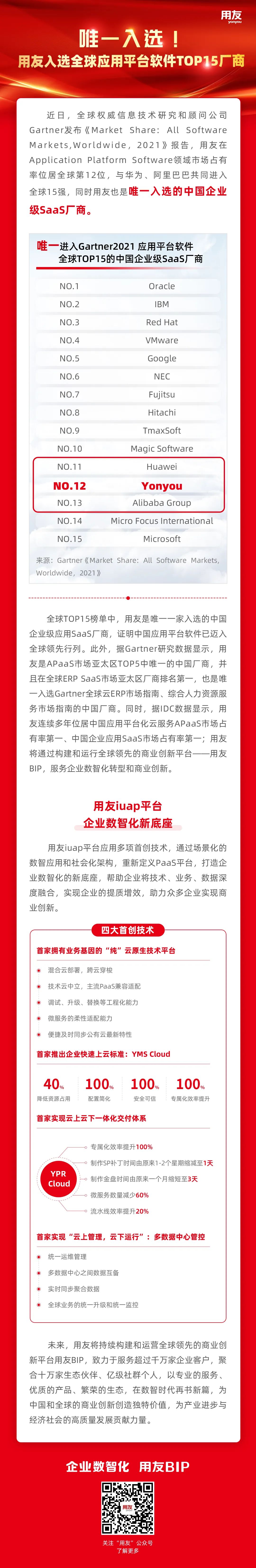 唯一入选!用友入选全球应用平台软件TOP15厂商