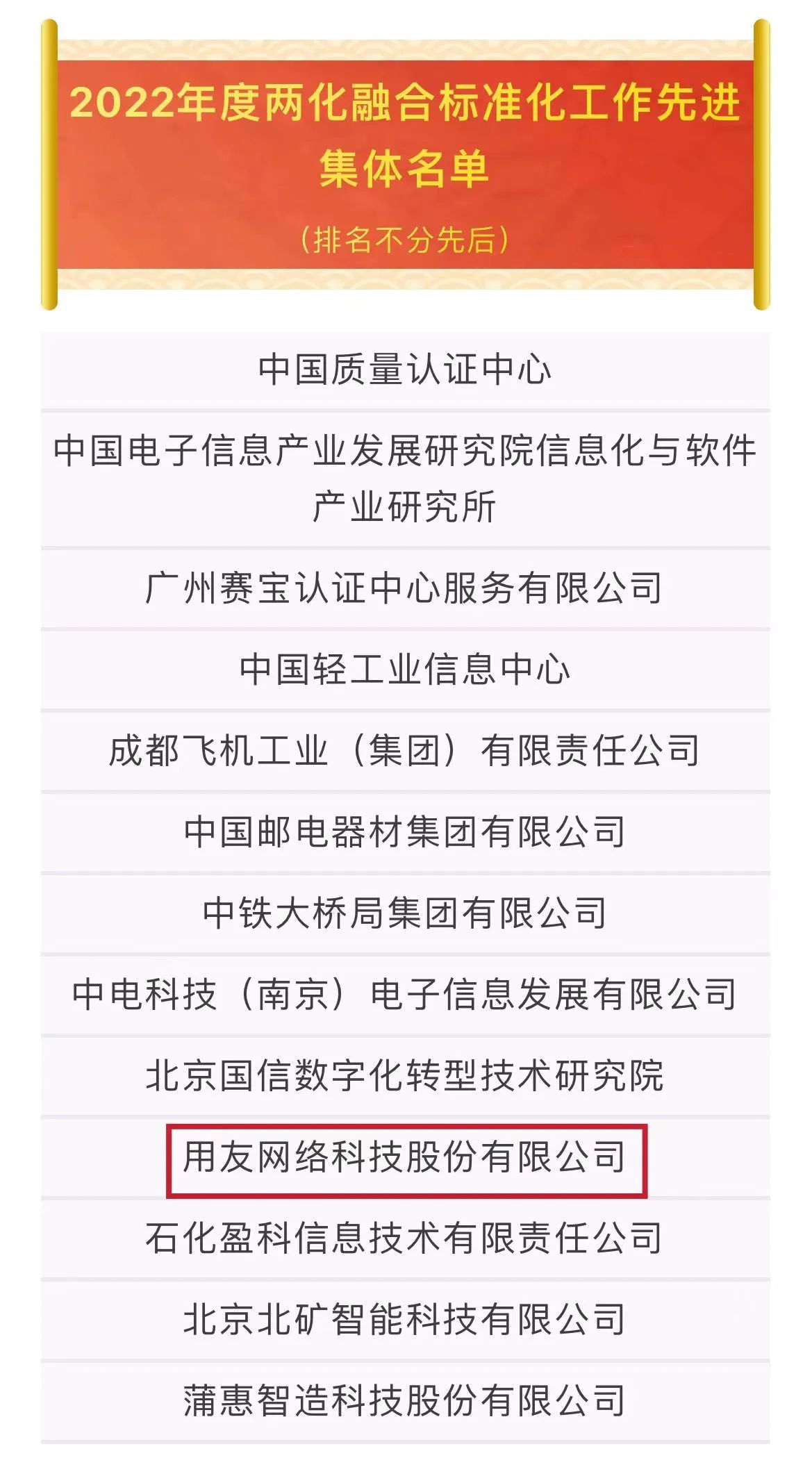 12月20日,全国两化融合管理标准化技术委员会公布2022年度两化融合标准化工作先进集体、先进个人、标准应用先进单位名单,用友网络科技股份有限公司荣获2022年度全国两化融合标准化工作先进集体。