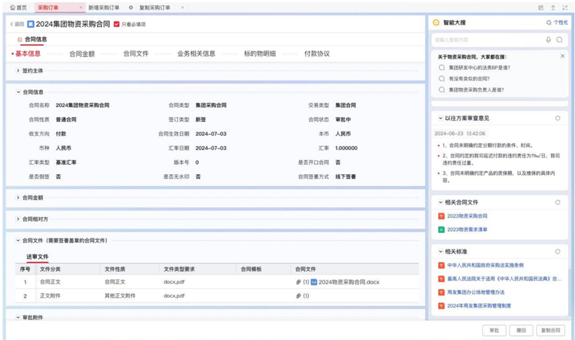 利用OCR识别能力,对合同关键信息进行提取和审核,确保符合法律法规及企业内部规定。基于采购目录展示同类采购合同的审核要点、制度文件,自动生成审核意见。