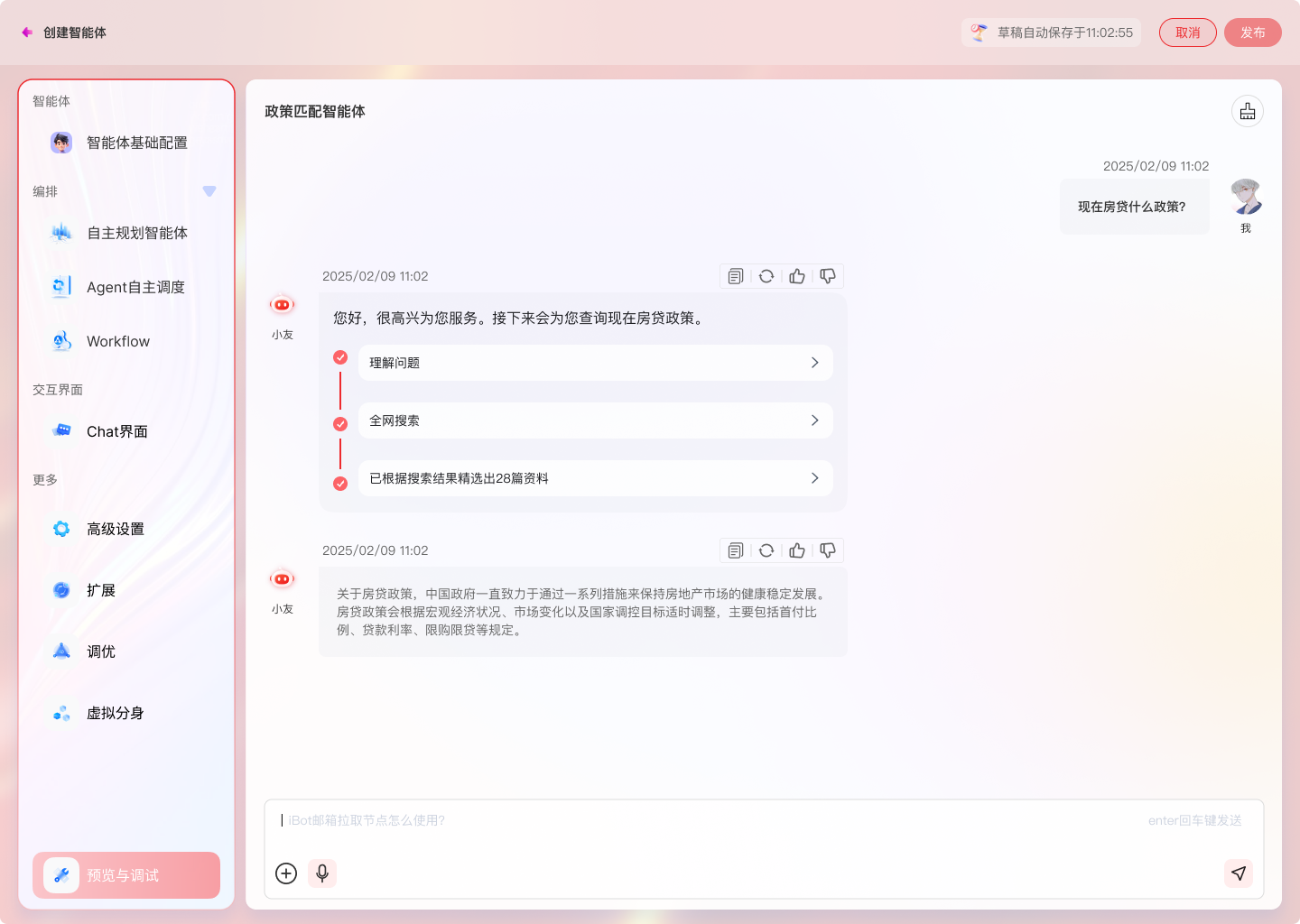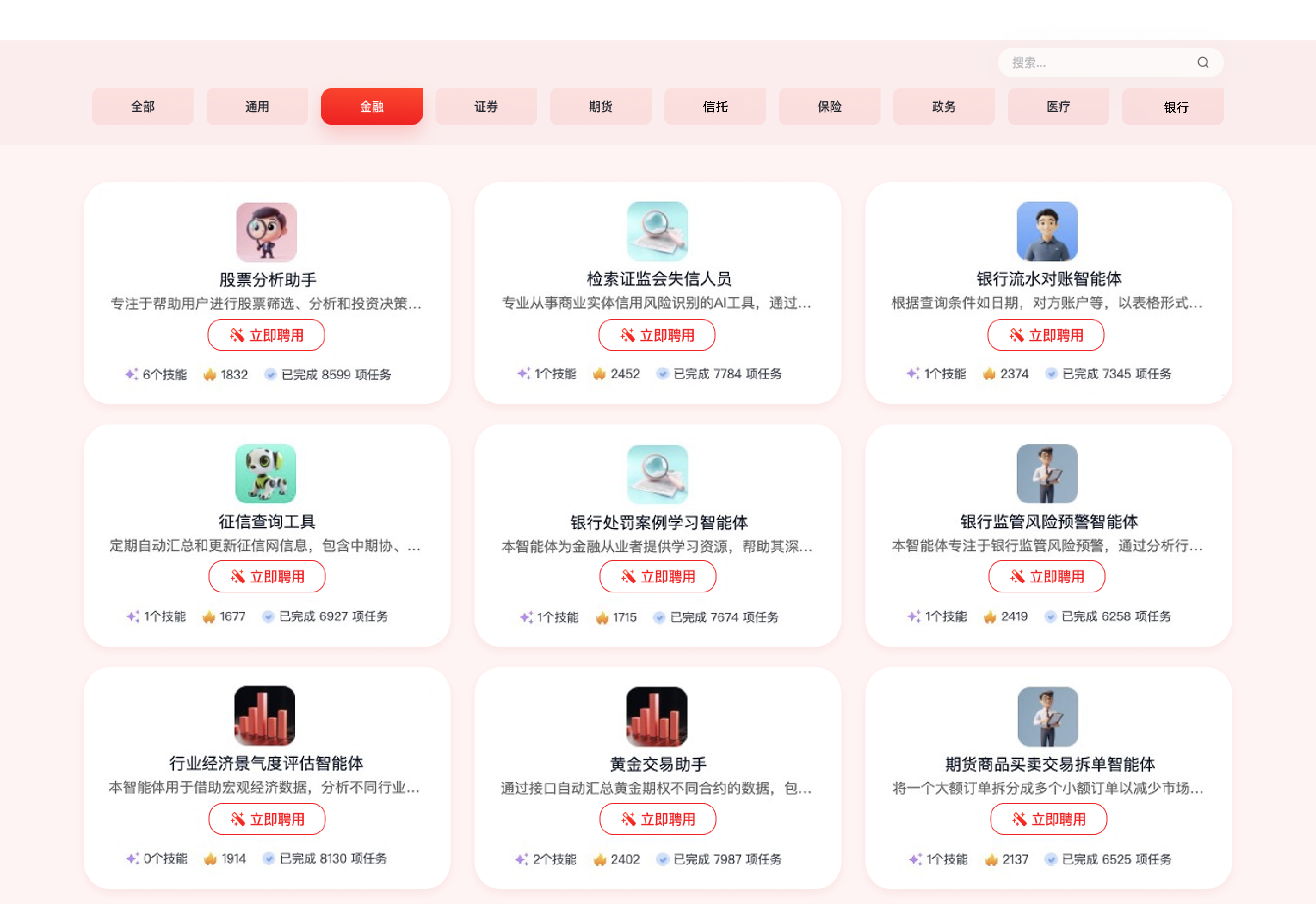 平台集成了4000+插件工具集,涵盖财务、供应链、人力、营销等多个领域,为智能体赋予强大的拓展能力,灵活应对不同业务场景。
