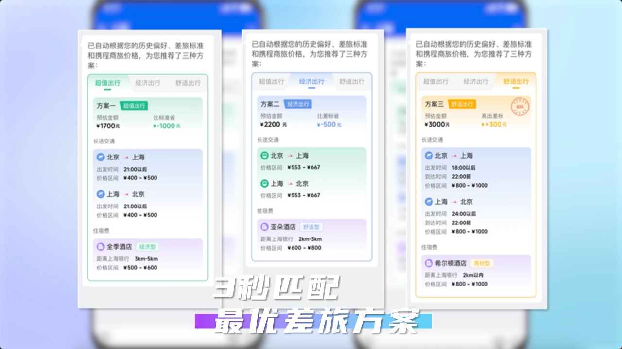 结合企业差旅标准、实时票务数据及历史消费记录,3秒匹配最优差旅方案(时间优先/价格优先/偏好优先)。