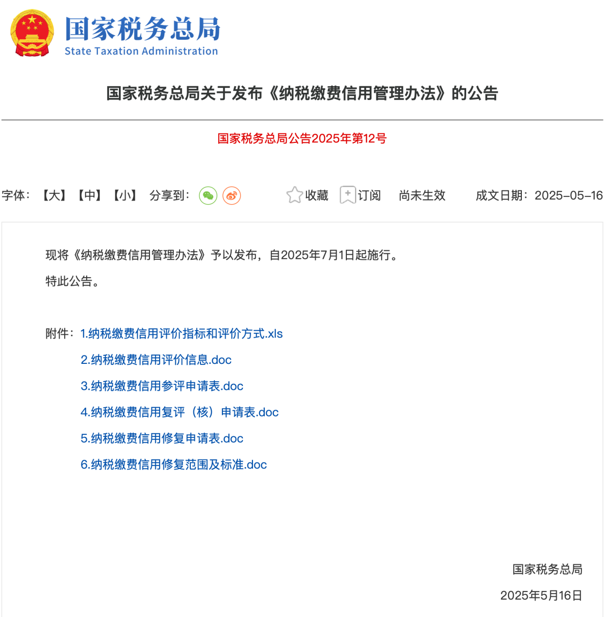 近日,国家税务总局正式发布《纳税缴费信用管理办法》(以下简称《办法》),进一步优化纳税信用评价体系,强化守信激励与失信惩戒机制。新政自2025年7月1日起执行。此次《办法》的发布,正是为了进一步优化纳税信用评价体系,强化守信激励与失信惩戒机制,推动企业更加重视纳税信用管理。