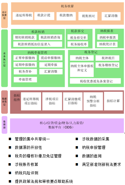 全面税务管理系统帮助银行进行集中税务管理,提供建立各税种缴纳申报的体系,涉税事项的监控、审批,在全行内部做到统一税务规章制度、统一各项税款的缴纳,监督银行日常经营中的各涉税事项的经营情况,规范税收的合理征收,规避税务风险。自动生成涉税的财务会计凭证,自动智能化处理生成各税种的申报表,提供纳税评估和预测分析报告。