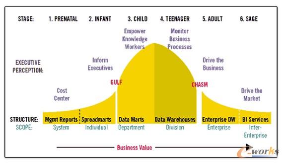 在数据仓库/商业智能的发展过程中,有两个关键点,在本模型中称为“海湾”和“鸿沟”。许多企业的项目就卡在这两个点上。他们一脚踩在过去,一脚踏入未来,无法完成飞跃。正因如此,这些企业从未完全进入下一个阶段并从中受益。