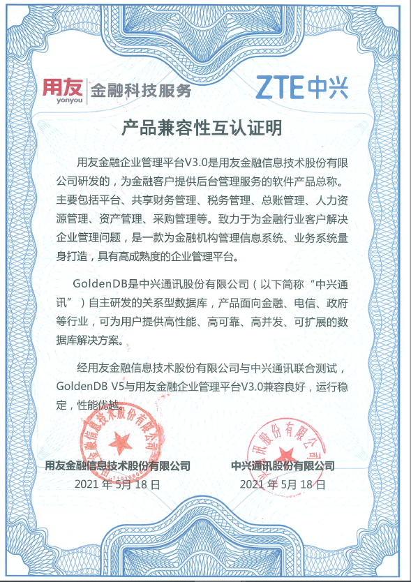 等国内信息化厂商互为认证证明后,再次获得国产化厂商兼容性认证--中兴通讯兼容性认证证书。