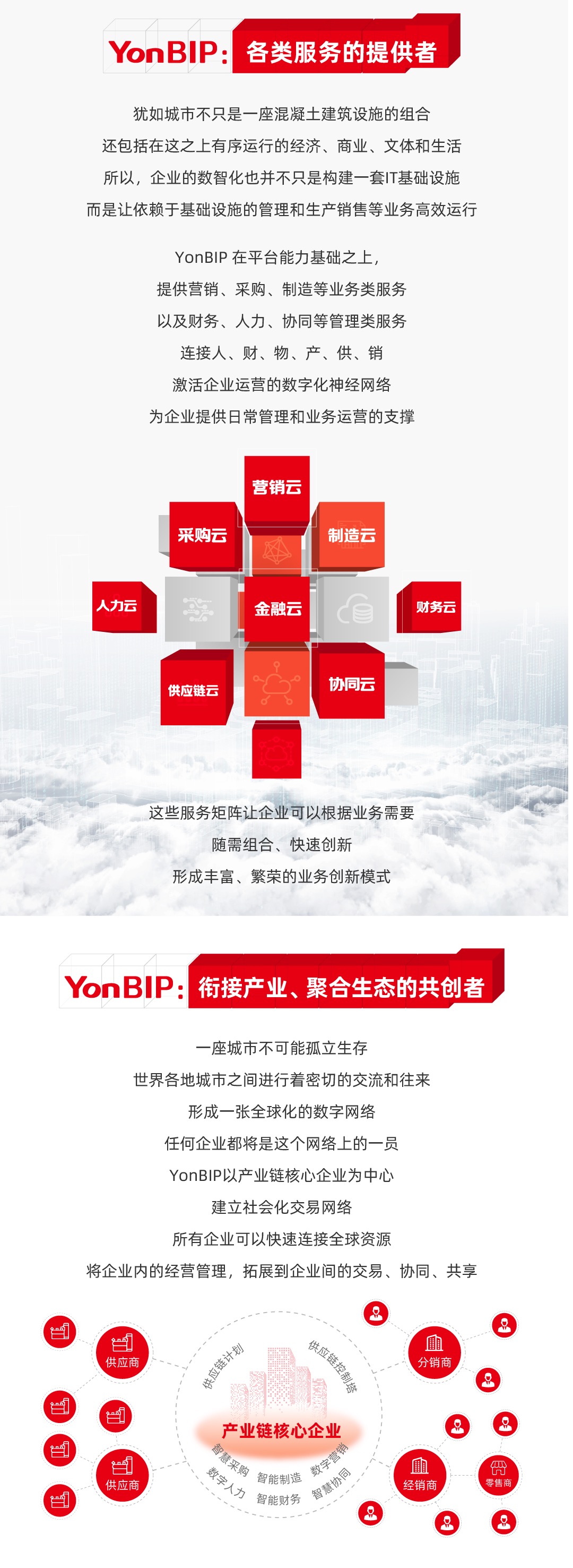 YonBIP 基于最新的大数据、人工智能、云计算、物联网&5G、移动互联网、区块链等数智化技术,采用云原生(含微服务)、元数据驱动、中台化、数用分离等新一代技术架构 ,构建技术平台 、数据中台、智能中台和业务中台,并聚焦财务、人力、协同、营销、采购、制造、供应链、金融等八大核心领域,全面支撑企业运营管理与产业价值链,使能企业数智化转型与发展,推动社会商业进步。
