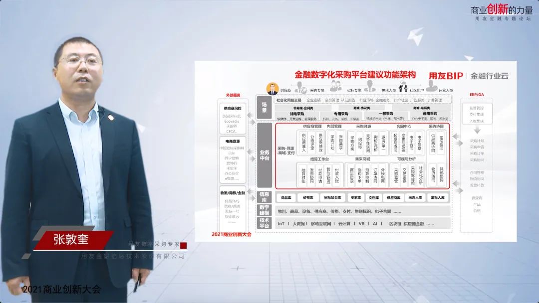 用友数字采购专家张敦奎分享了,数字化转型大潮中,金融行业采购必须在“合规+效率”的基础上实现创新发展。