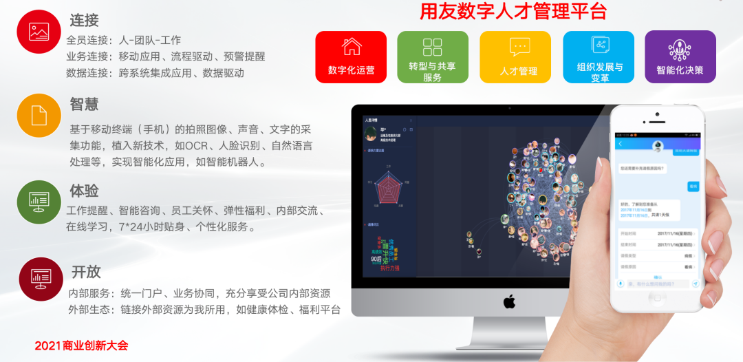 用友DHR专家黄洁提出,在国家大力提倡金融科技创新的时代背景下,金融行业极积极把握数字经济发展所形成的新投资机会,寻求数字化转型之道,用友数智人力应用全景,助力HR全面智能化,强化HR的组织能力价值导向,重塑人才价值主张,赋能员工,激活组织。