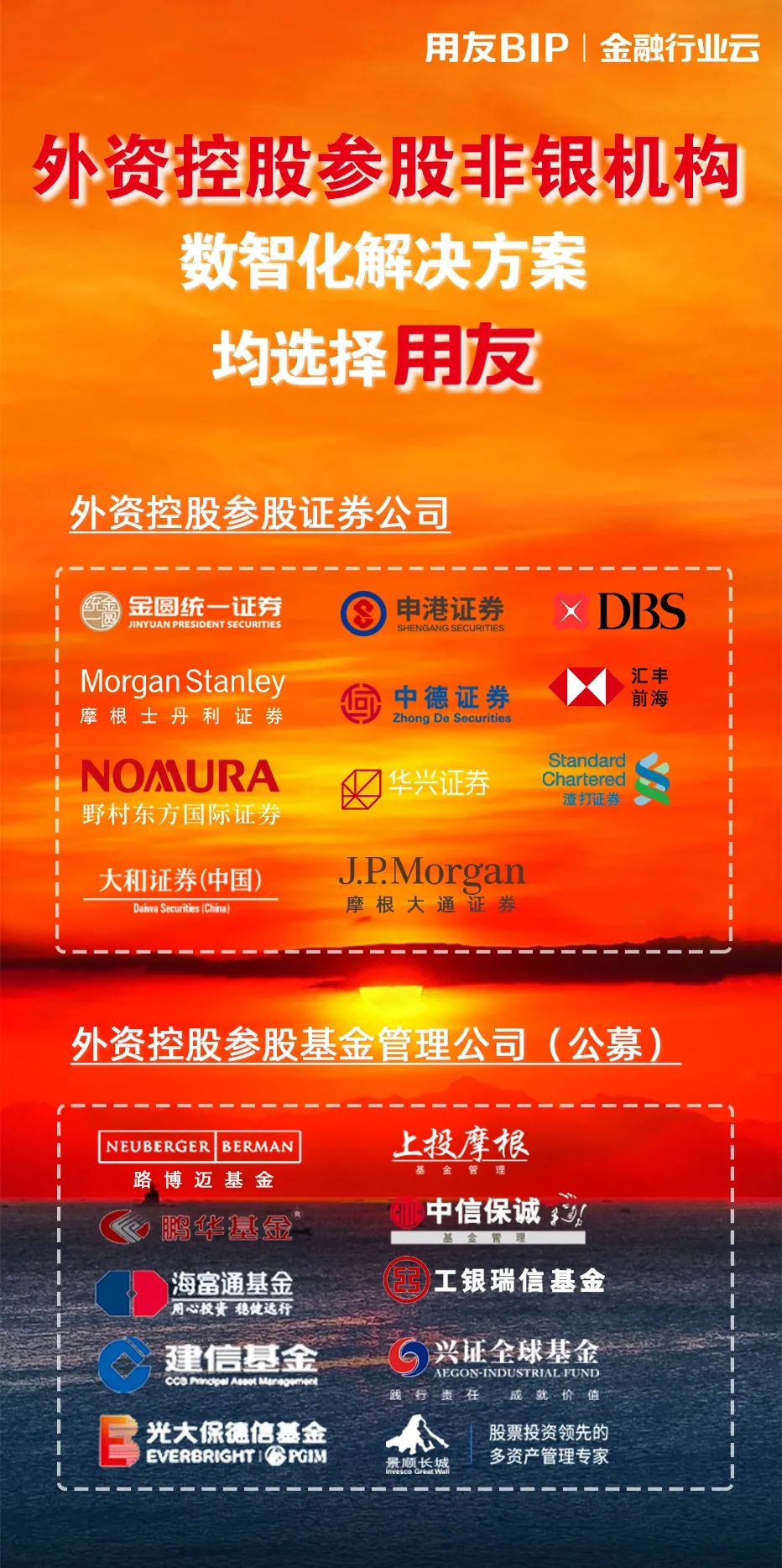 证监会于2020年全面放开证券、期货和基金管理公司外资股比限制,外资机构在经营范围和监管要求上均实现国民待遇,很多国际知名机构加快了在华投资展业步伐。2020年以来,外资参股已开业的券商有:摩根大通证券、野村东方国际证券、大和证券、星展证券、金圆统一证券均选择用友为其提供券商行业数智化产品及解决方案。