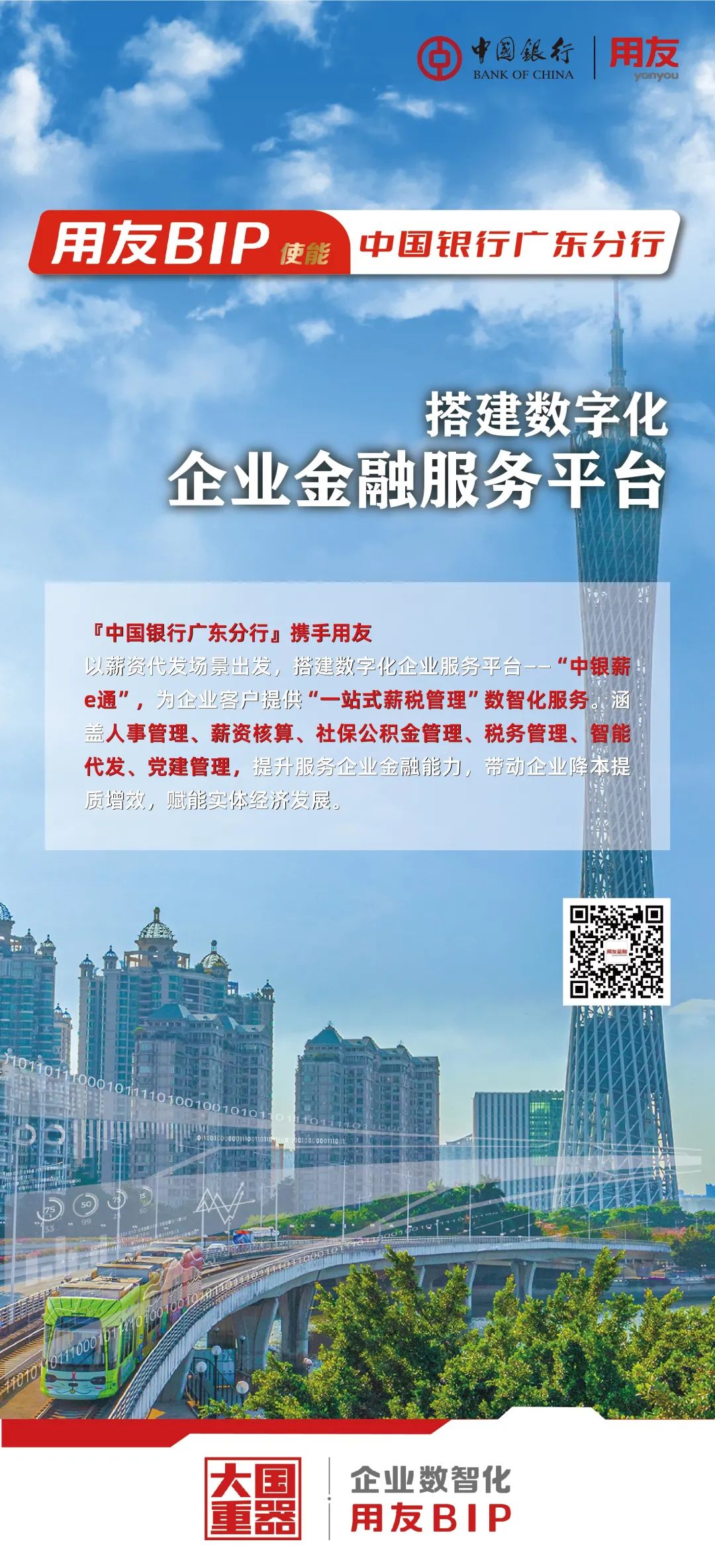 中国银行广东省分行以薪资代发场景出发,搭建数字化企业服务平台——“中银薪e通”,为企业客户提供“一站式薪税管理”数智化服务。是中国银行广东省分行“以客户为中心”提升客户服务质效的重要举措,也是提升服务企业金融能力的关键平台。系统于2021年底正式投入使用,截至目前,已成功实现近1000家企业注册用户,预计未来将助推中国银行广东省分行4万多家代发薪企业以及60多万户对公结算客户运用新一代信息技术实施数字化转型升级,带动企业降本提质增效,赋能实体经济发展,为广东建设数字经济强省、打造广东发展新优势提供有效支持。