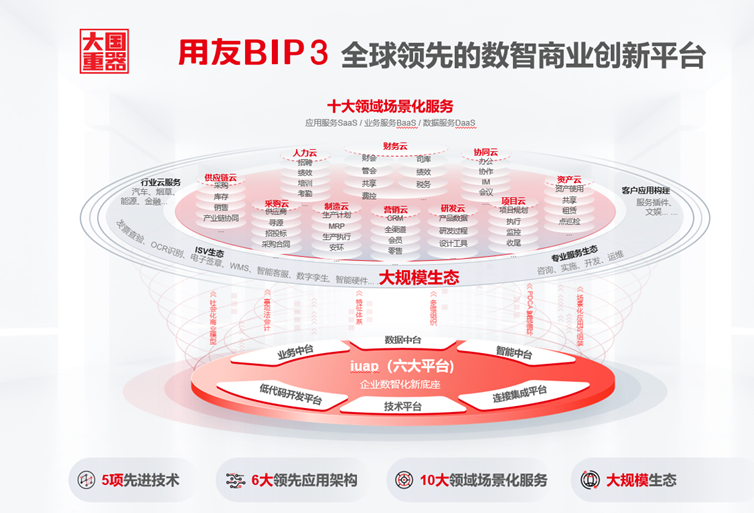 经过6年的规模研发、持续迭代,全球领先、大国重器用友BIP 3正式发布。用友BIP 3是用友BIP里程碑新品,是更成熟的融合服务群,从平台技术、应用架构到场景服务、用户体验、生态体系全面突破创新,达到了全球领先水平。