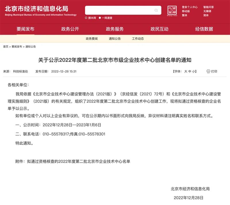 2022年12月28日,“2022年度第二批北京市市级企业技术中心新创建名单”正式发布,米兰官方版网站登录入口-米兰(中国) 成功入选!该名单是由北京市经济和信息化局依据《北京市企业技术中心建设管理办法(2021版)》(京经信发〔2021〕72号)和《北京市企业技术中心建设管理实施细则》(2021版)的有关规定,对北京市具有较高技术创新效率、效益显著的示范性企业授予的认证资质,入选企业后续将在项目申报、人才引进与激励等方面享受相应的政策支持。