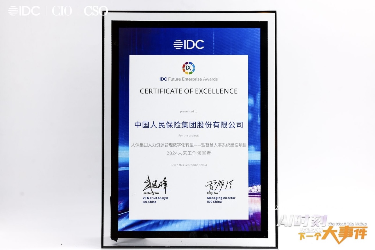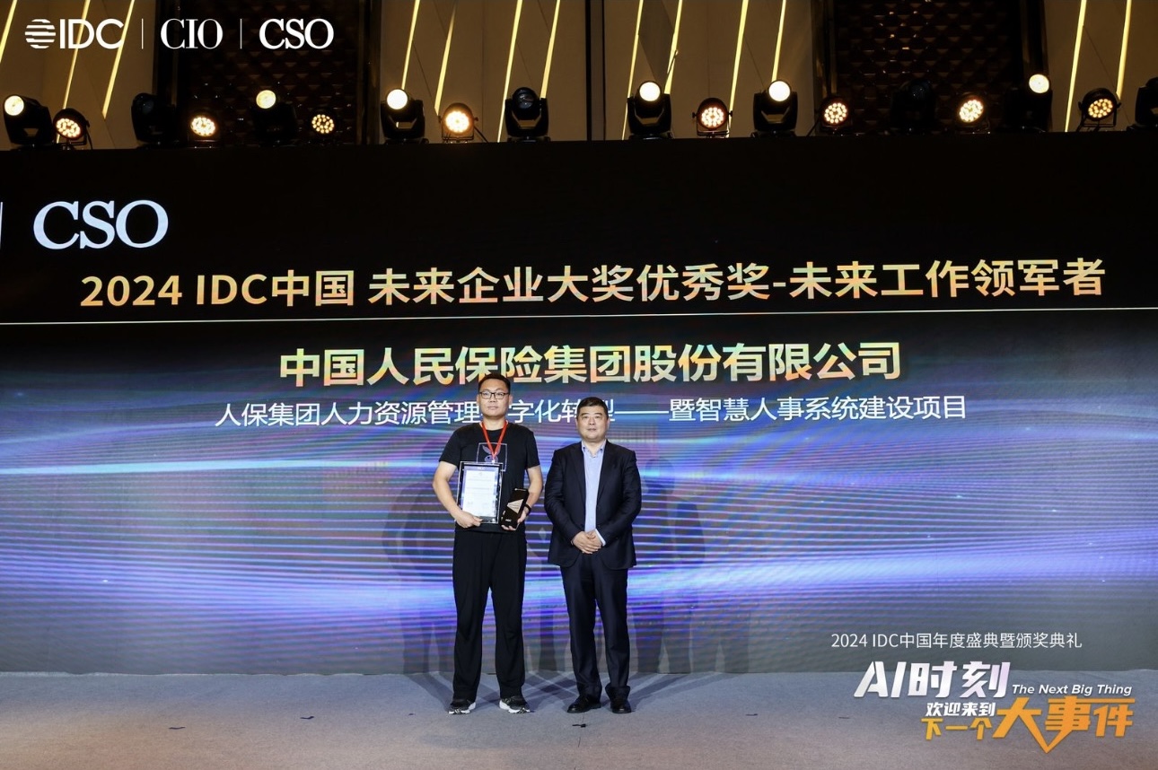 2024 IDC中国年度峰会暨颁奖典礼在上海成功落幕。世界五百强巨头、全球保险业翘楚中国人民保险集团股份有限公司 “智慧人事系统建设项目”,凭借其卓越的创新实践与深远影响力,在众多精英项目中脱颖而出,荣获2024 IDC中国未来企业大奖“未来工作领军者”称号。这一殊荣标志着中国人保在数智化转型方面所取得成就获得权威认可。