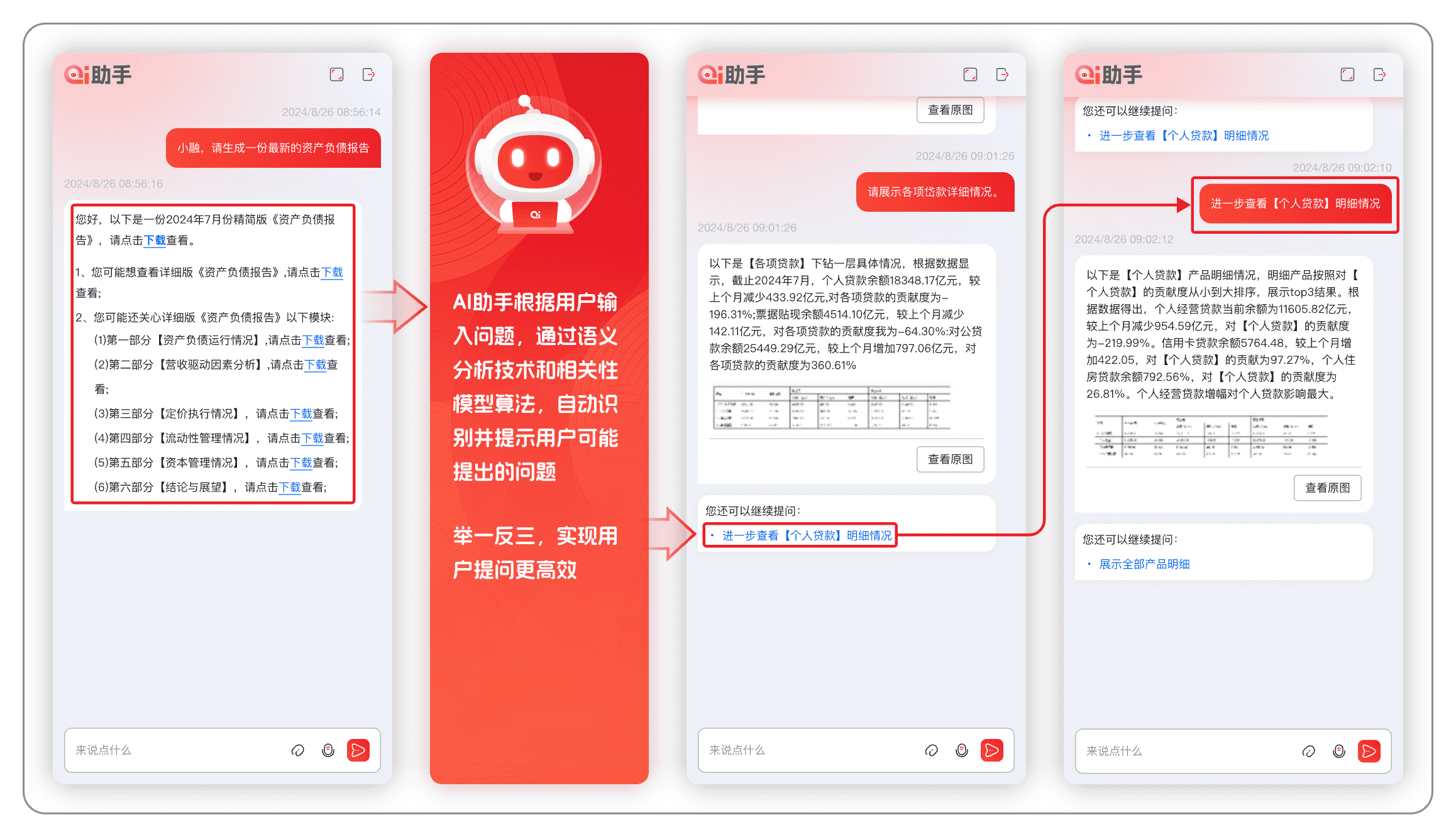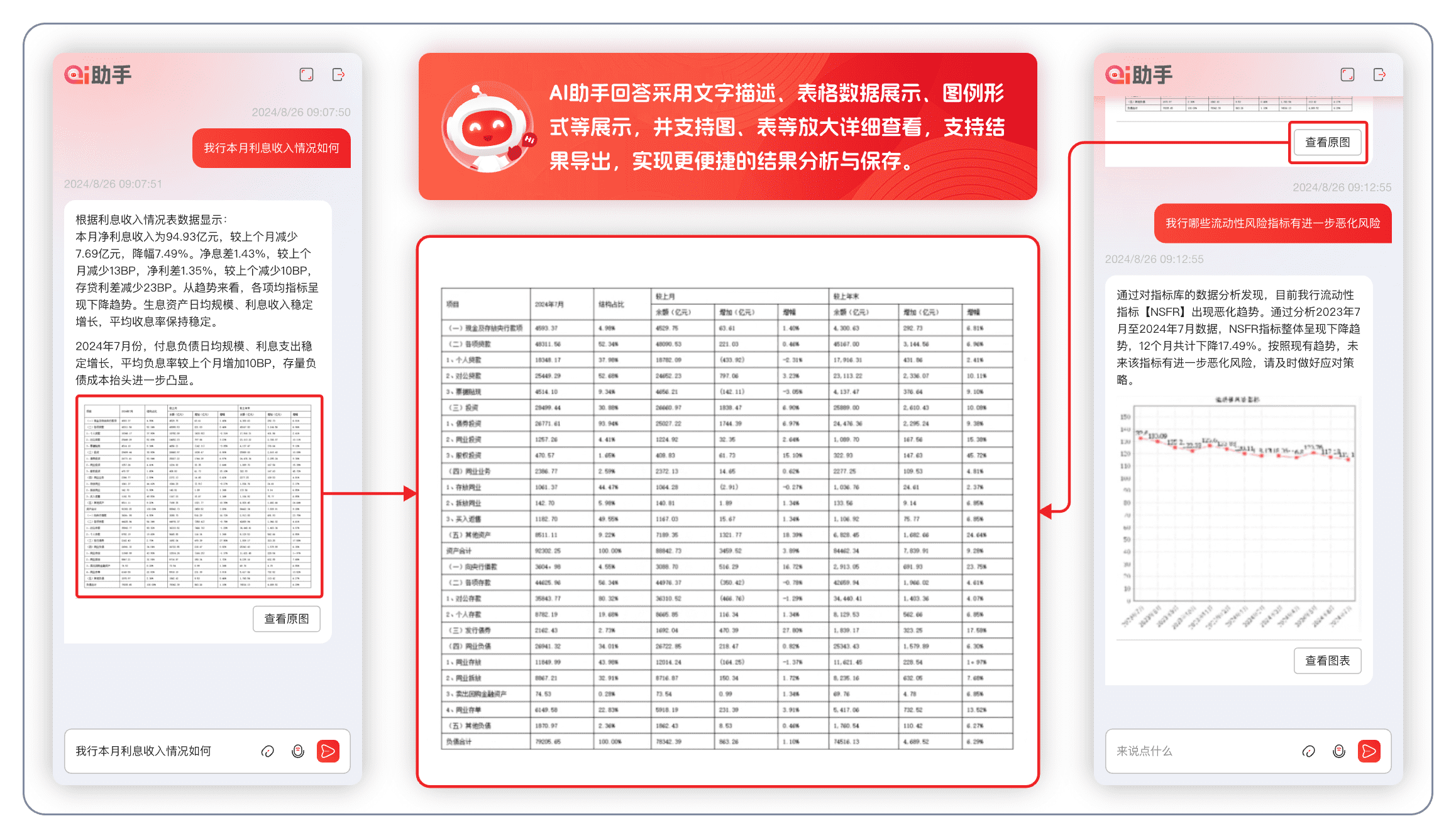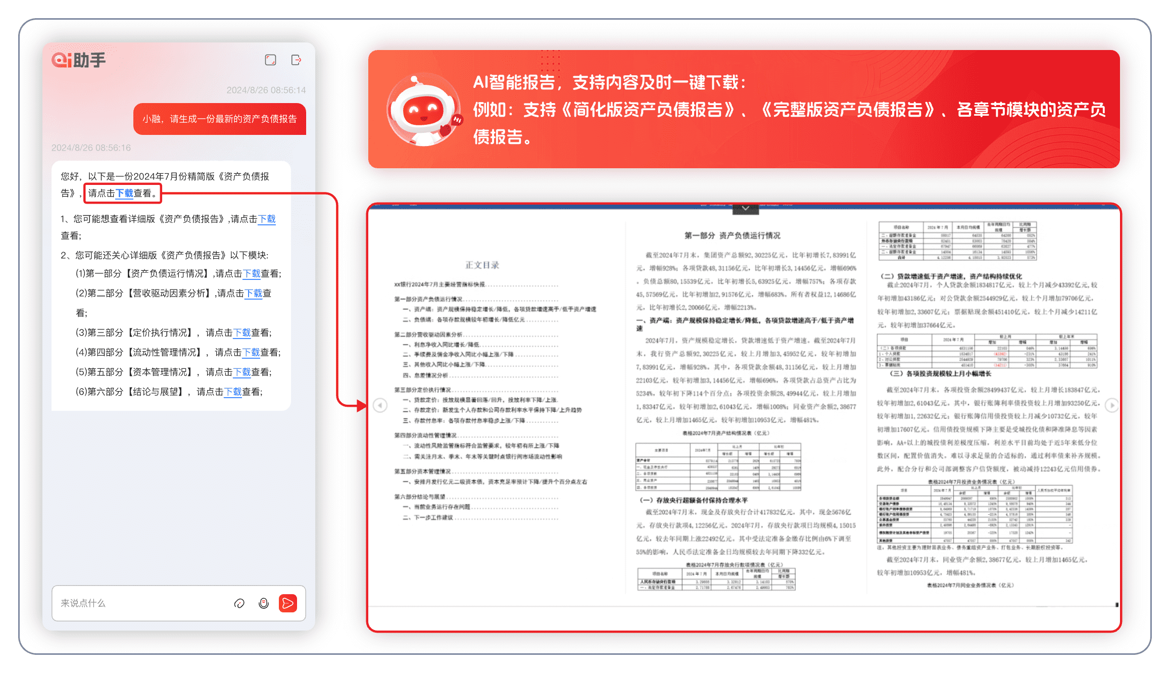 报告即时响应:AI助手"小融"支持报告内容随时生成并一键下载,可选择多种版本和范式,例如支持《资产负债日报》、《资产负债月度分析报告》、也可选择互动摘取专题资产负债报告,报告的问答解析准确率达98%。