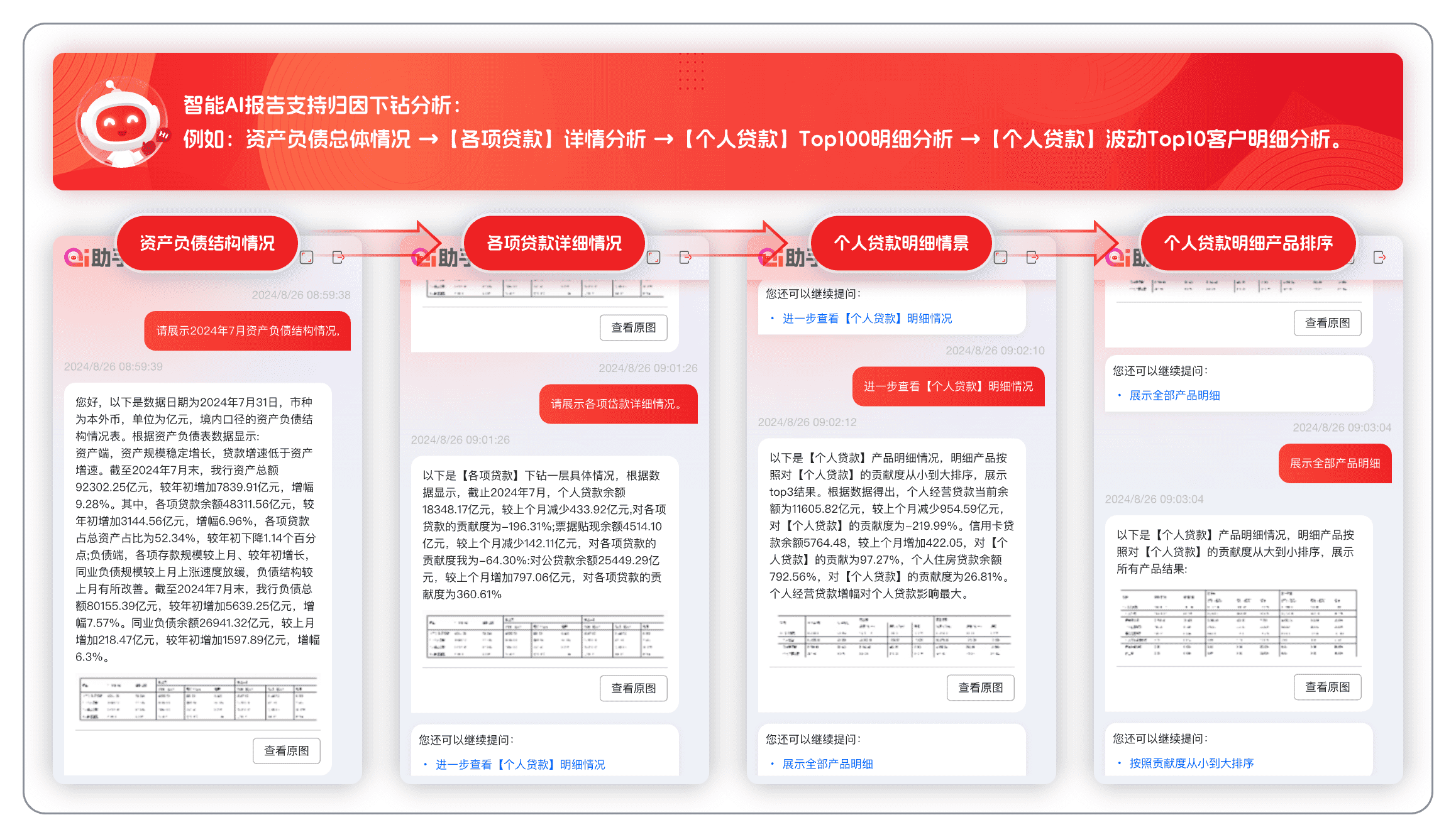 信息全链路穿透:资负的总量结构及风险指标分析可穿透到逐笔业务,问题追溯通过问答方式穿透到单账户明细级数据信息。如科创类贷款产品的规模增长,可问答提示追溯到单笔贷款规模集中度最大的客户,以及该客户名下多笔存贷款规模、价格、期限等明细。