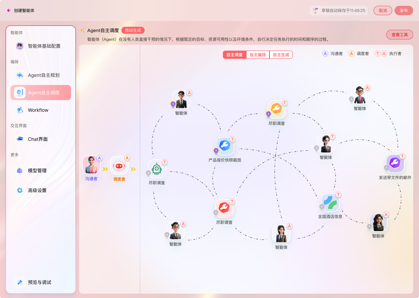 多智能体协作模式可调用不同工具或智能体协同工作,实现任务间的无缝衔接。并根据实时情况动态分配任务,确保每个智能体都在最合适的时机执行最合适的任务,最大化资源利用率。