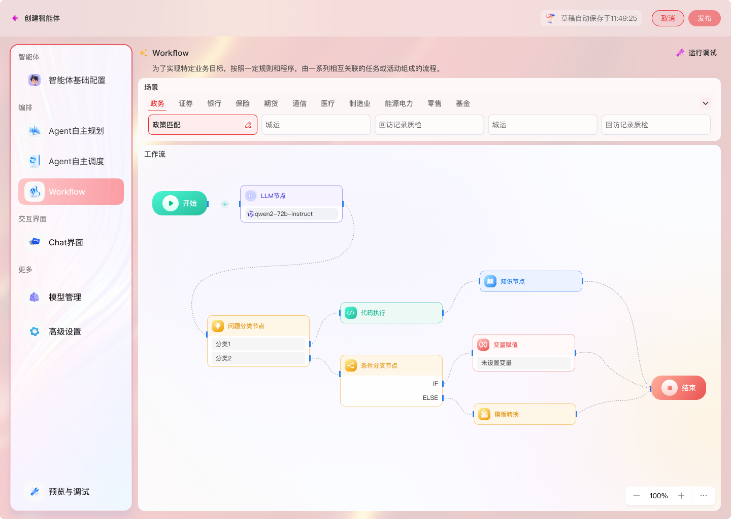 通过低代码操作,企业可以轻松整合提示词、业务数据集与插件工具,构建适用于特定场景的半自主智能体,显著提升生产效率。