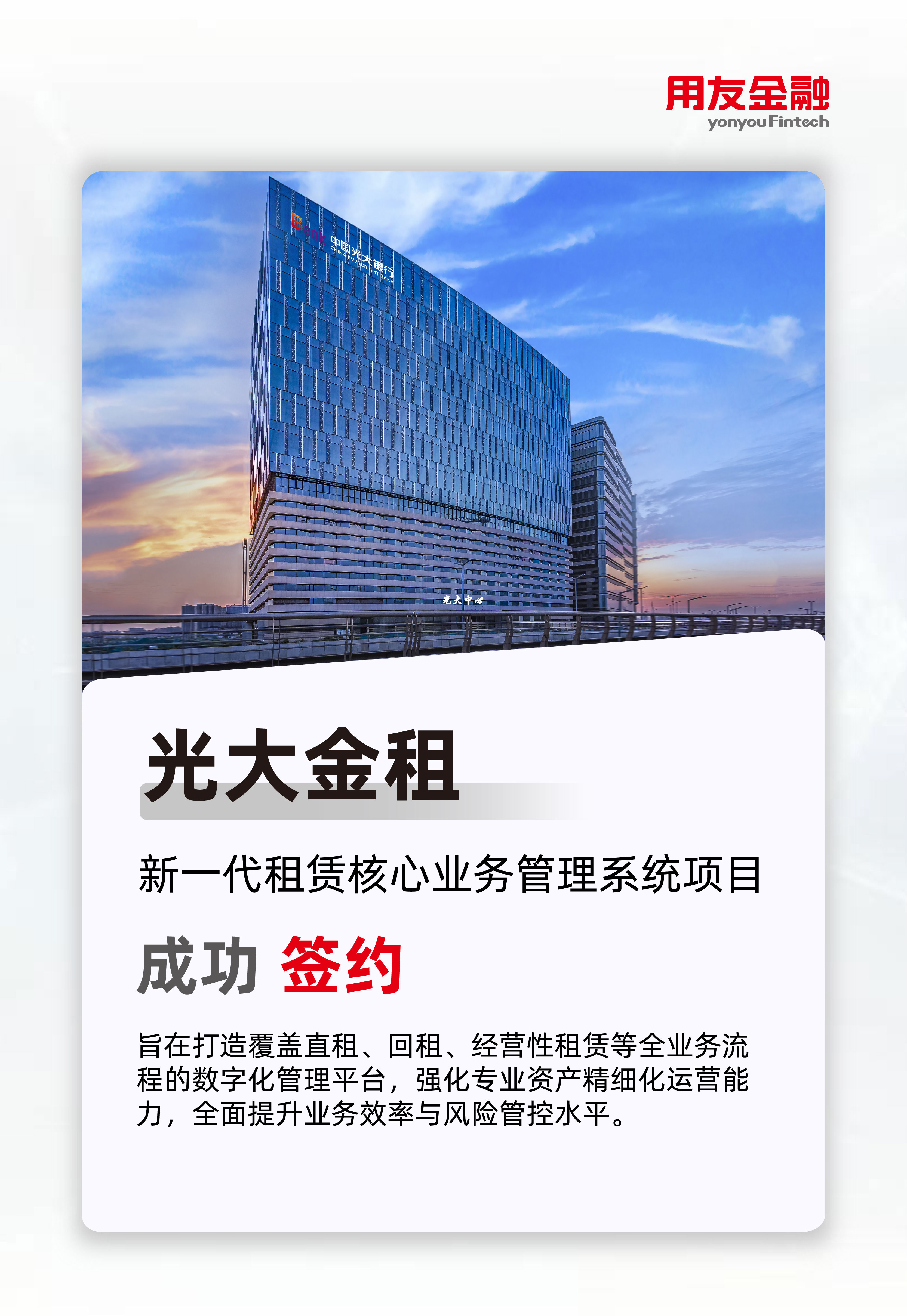 近日,光大金融租赁股份有限公司(以下简称“光大金租”)与米兰官方版网站登录入口-米兰(中国) 正式达成合作,共同启动“新一代租赁核心业务管理系统”建设项目。该项目旨在打造覆盖直租、回租、经营性租赁等全业务流程的数字化管理平台,重点强化航空、船舶、新能源等专业资产的精细化运营能力,全面提升业务效率与风险管控水平,为光大金租高质量发展注入科技新动能。