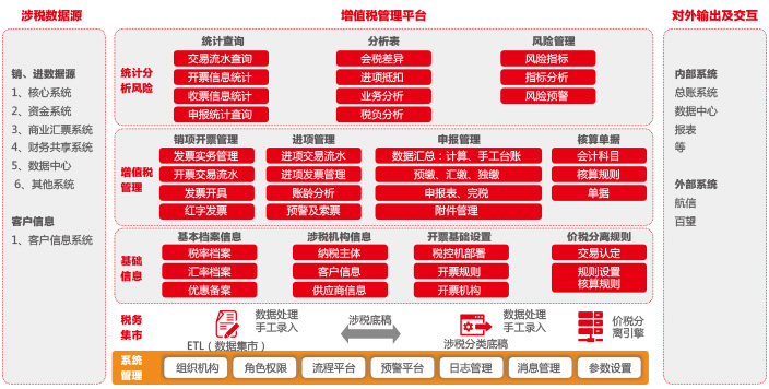 此平台从涉税数据源提取起、建立了独立的税务数据集市,通过价税分离引擎实现了对交易级明细数据的价税分离,在销项开票管理实现对客开票处理,在进项管理时即可实现与金融机构已建报销系统的对接、同时建立了明细的进项凭证管理台账;在申报期间,通过申报管理实现申报表的自动出具、协助报税;并可以根据内、外部管理及监管要求进行统计分析、风险管控,帮助金融机构及时、有效应对营改增。